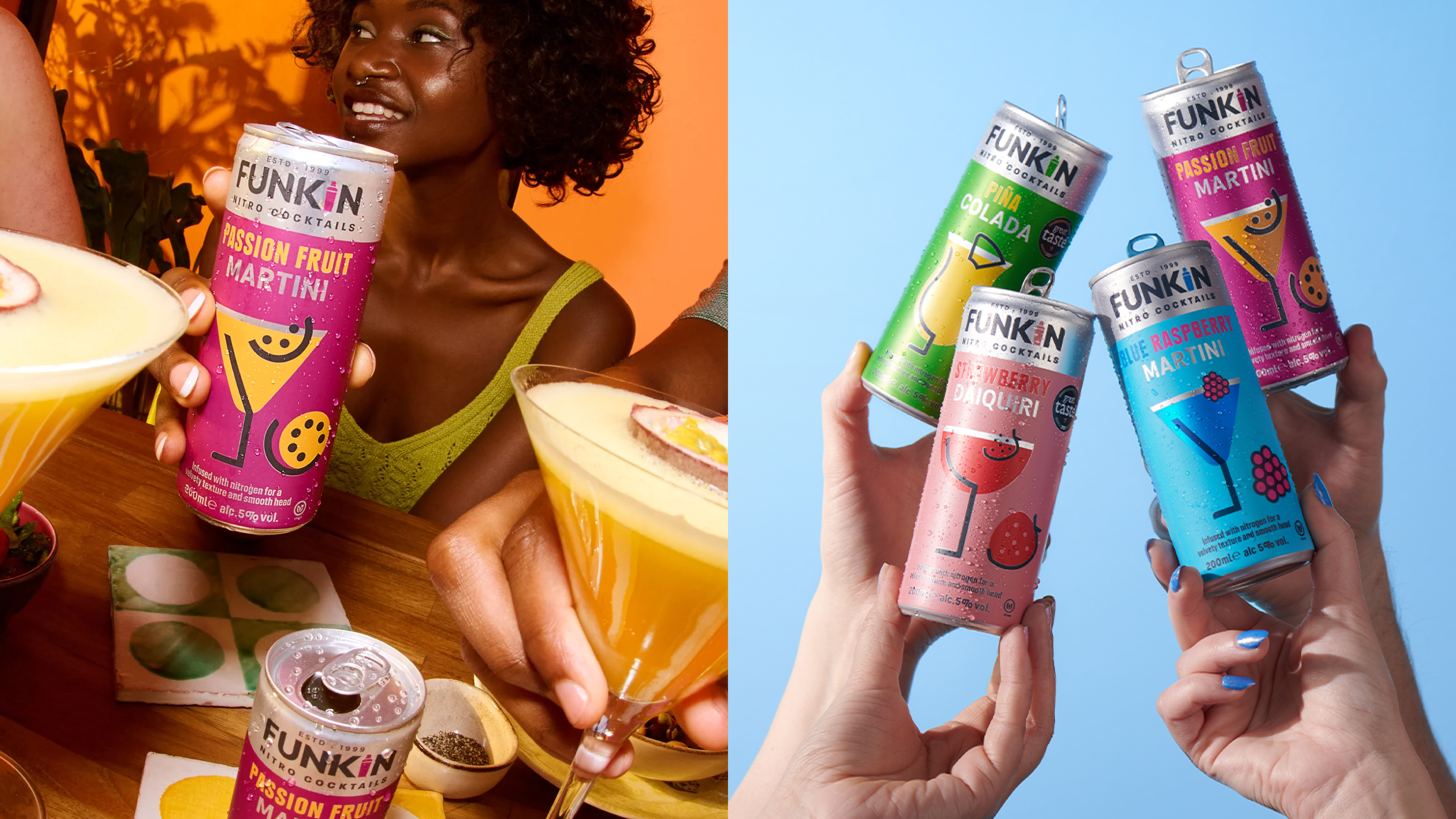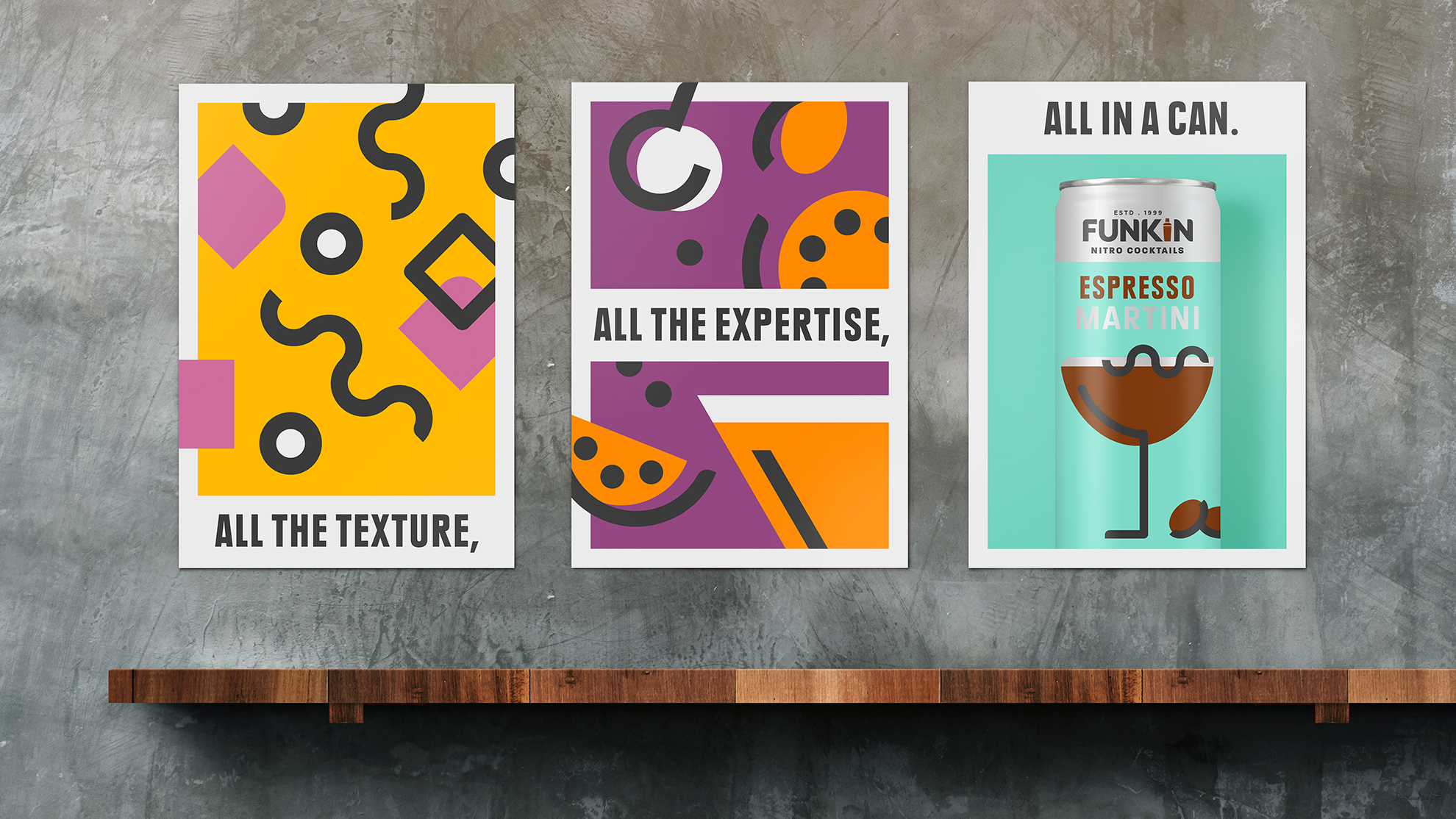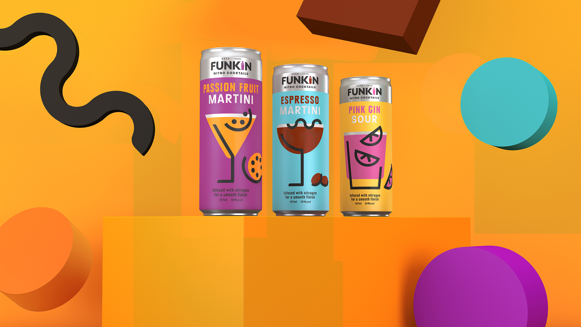 NitroCocktailsAll of the texture, taste and expertise of a freshly mixed cocktail, in a can. We developed a flexible illustration style, born of the edges and contours of the Funkin logo. This allows us to create a simple illustration for each and every cocktail in the range. The ecclectic nature of the graphics, combined with the vibrant colour palette, captured the cocktail drinking experience for Funkin.